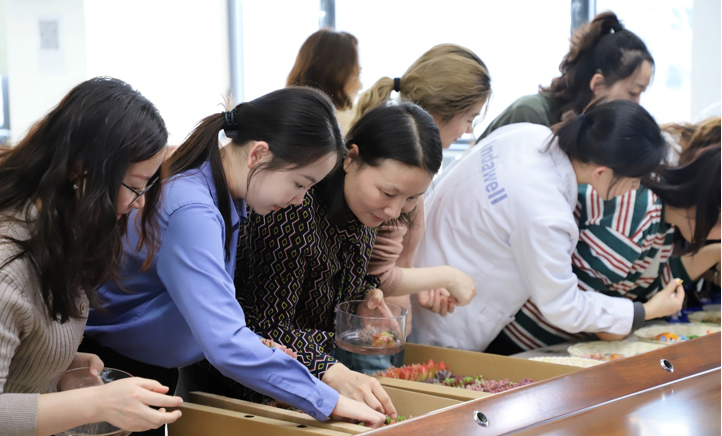 活动开始,兴趣小组邀请了从业多年的专业花艺老师在现场为大家进行讲解,从种植材料及步骤到养护的注意事项都进行概述和说明,之后对大家的实操进行辅导。在微景观容器中布置从岩石层—土壤层—苔藓层—植物层进行,很多员工选择了玻璃瓶器,根据自己的想法和喜好,有的用银线蕨、网纹草,有的用罗汉松、袖珍椰子等植物进行装扮,还有的员工选择了多肉,搭配木盒别有一番趣味。搭配了彩色的河沙,透明的雨花石,还装饰了一些可爱的小摆件,构造起了自己独特的微景观。